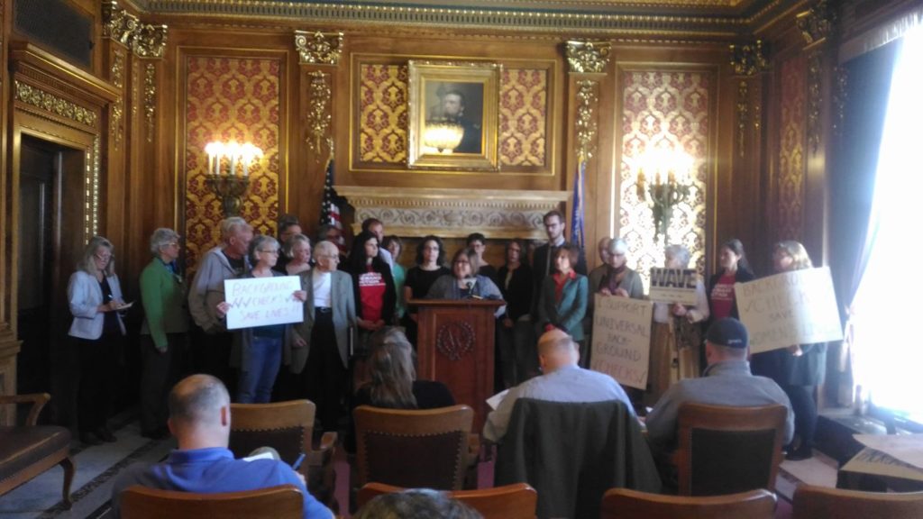 WAVE volunteers turned out to support the kick-off press conference of the Wisconsin Gun Safety Coalition at the State Capitol. The coalition’s endorsement of a bill to require background checks on every gun sale was also announced at that time. Coalition members include: End Domestic Abuse Wisconsin, Dr. Elizabeth Neary, Jean Papalia, Mental Health America of Wisconsin, Moms Demand Action for Gun Sense in America Wisconsin Chapter, National Physicians Alliance Wisconsin Chapter, National Association of Social Workers Wisconsin Chapter, Rep. Terese Berceau, Rep. Melissa Sargent, Rep. Lisa Subeck, Rep. Chris Taylor, Sen. LaTonya Johnson, Wisconsin Alliance for Women’s Health, WAVE Educational Fund, Wisconsin Council of Churches, Wisconsin Physicians for Social Responsibility.