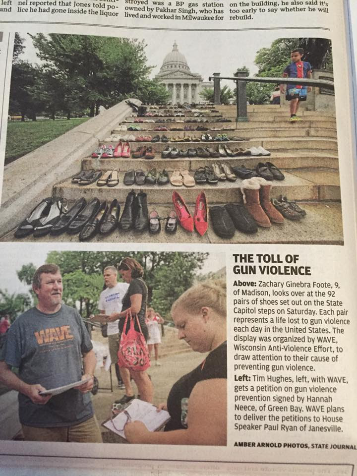 Our Madison group, for example, created a one-day display of 92 pairs of shoes at the Capitol to represent the 92 Americans killed in gun violence each day. The display generated a tremendous amount of media coverage and resulted in many signatures on a petition to pass a federal background check law.