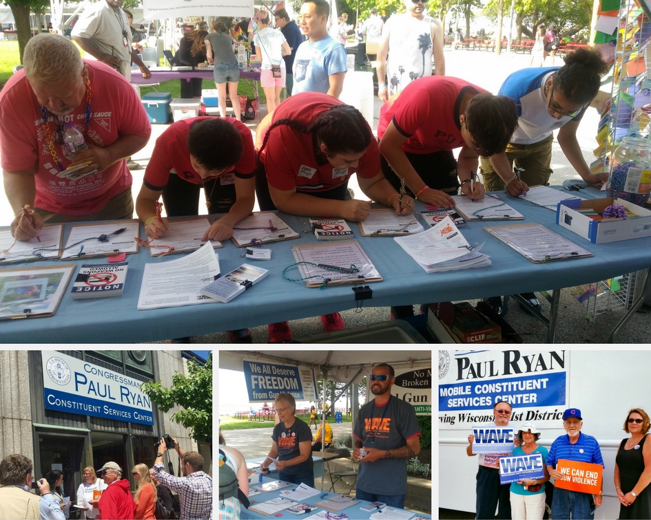 After one of the worst mass shootings in American history, WAVE activists gathered signatures at events across Wisconsin’s First Congressional District, and constituent volunteers called on House Speaker Paul Ryan to move forward a bill for universal background checks. The petitions were delivered by WAVE’s volunteers to Speaker Ryan’s staff at his district offices and during mobile office hours.